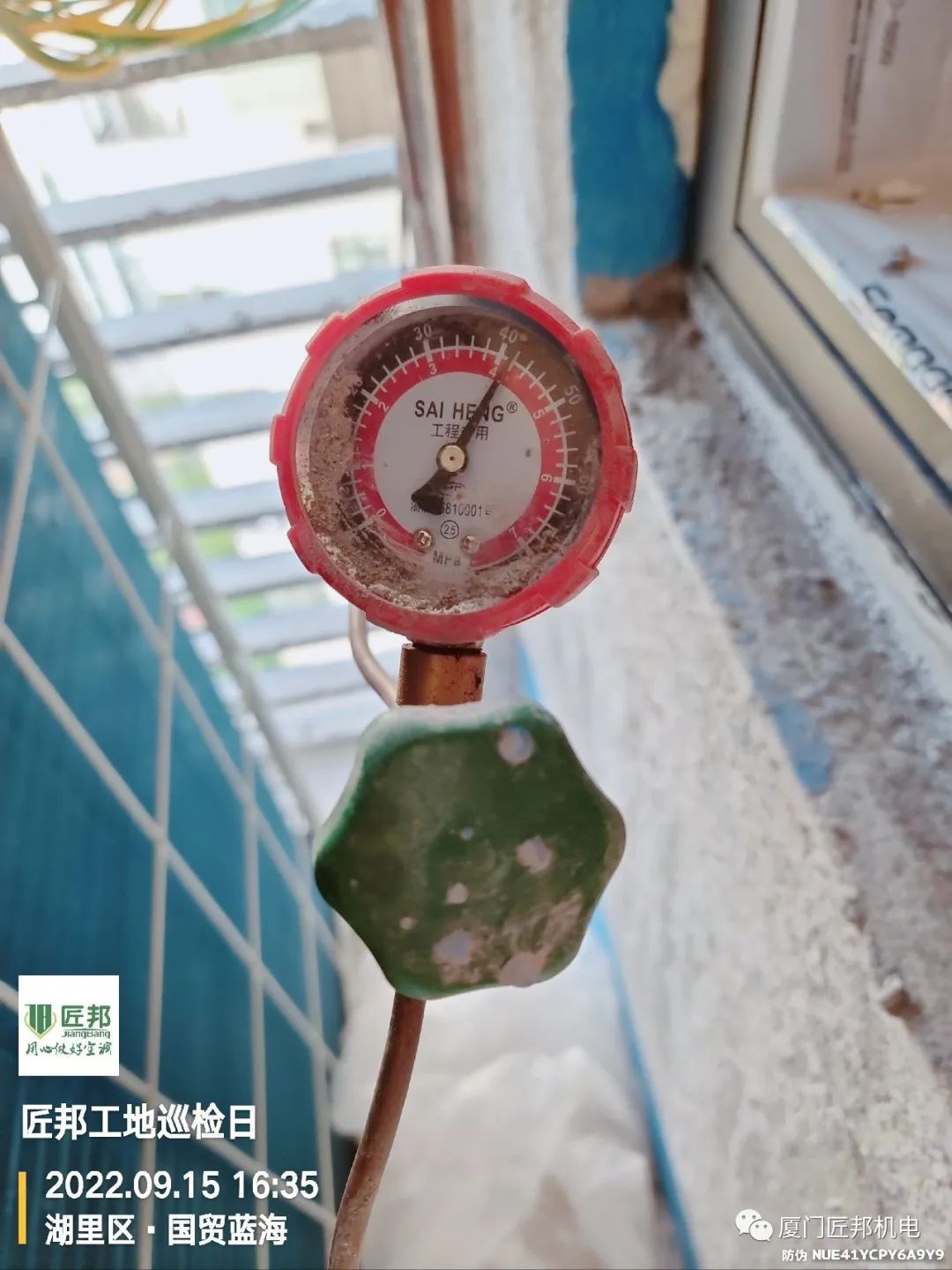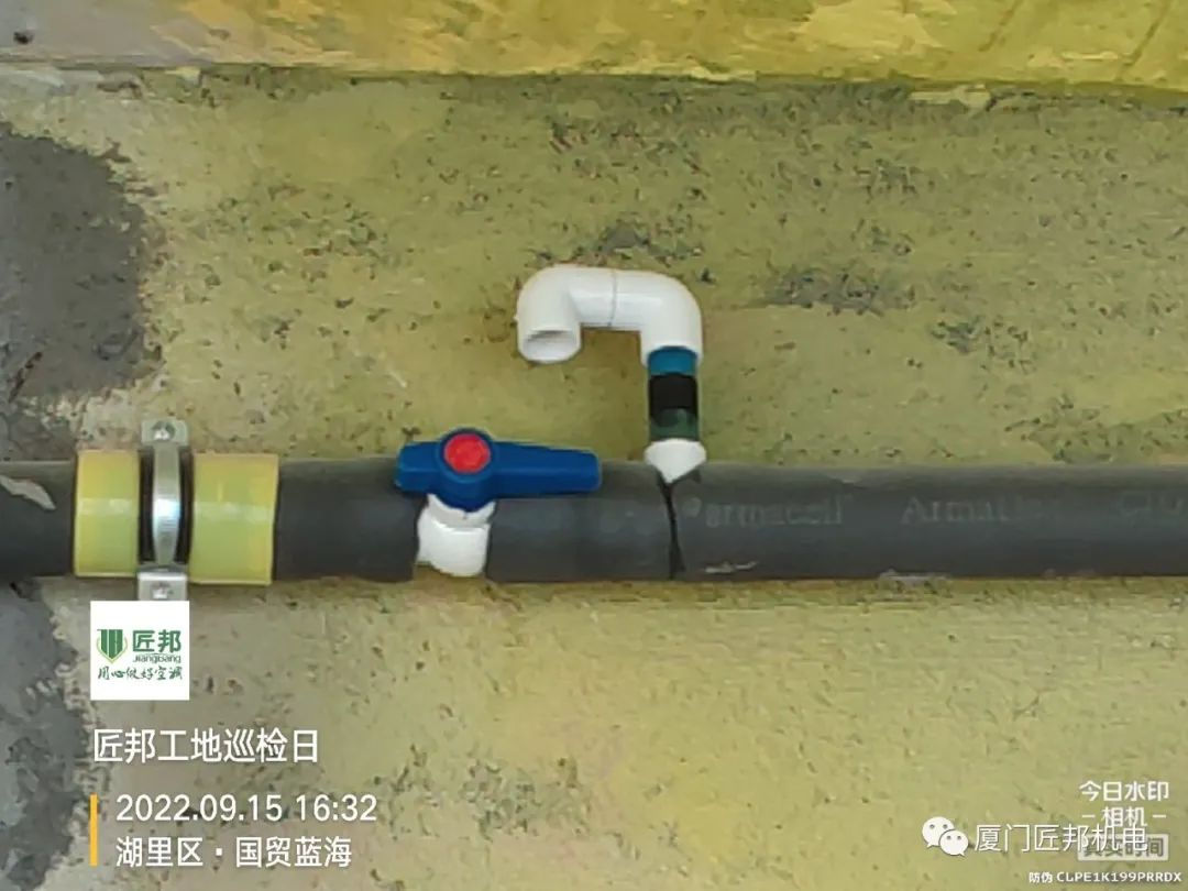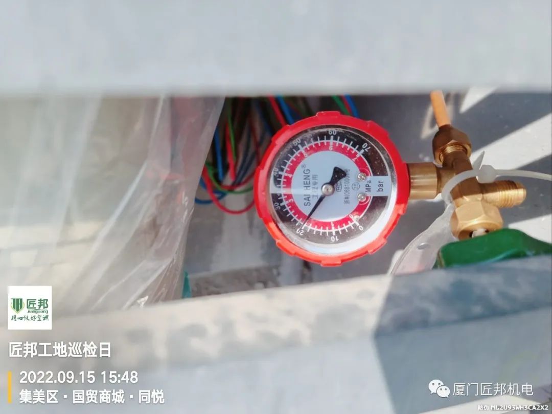 现场空调已吊装完毕并进入系统保压测试阶段,即充入4Mpa的氮气(未保主机)进行48小时的观察,届时匠邦监理会上门查看压力情况,压力不变才能保证系统密闭无泄漏点,后期可以正常使用。