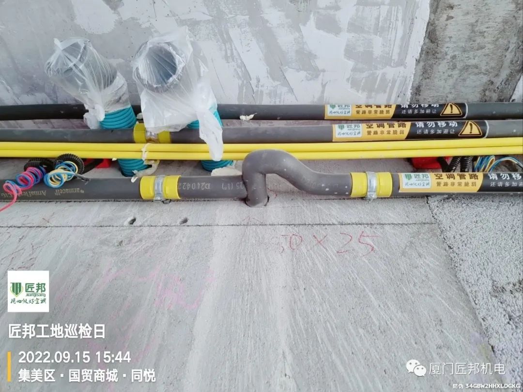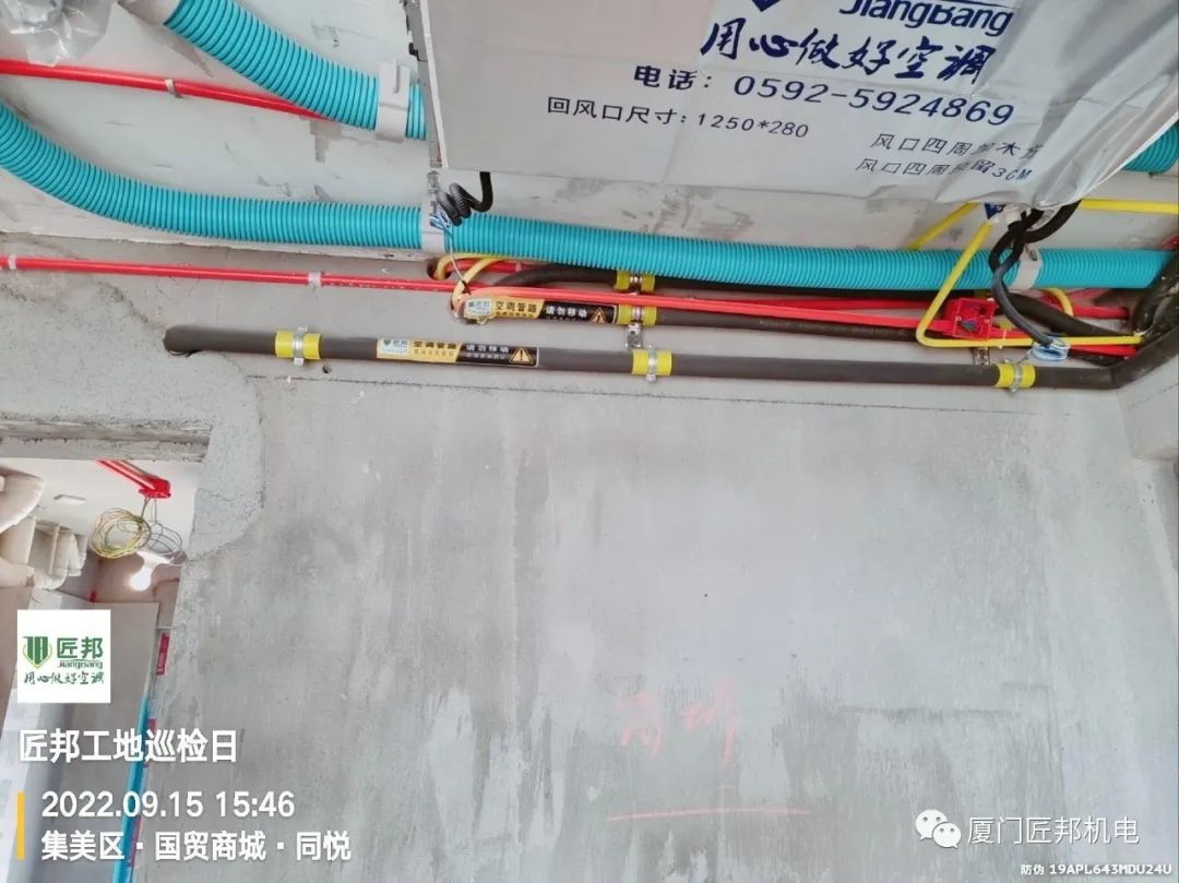 为确保空调排水管维持1/100以上的排水坡度保障排水流畅度,我司全程单独吊装排水管并通过弹墨抖线来确保倾斜度。