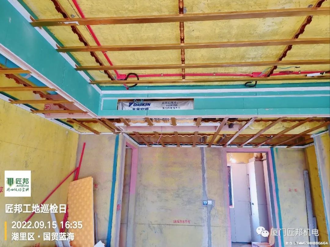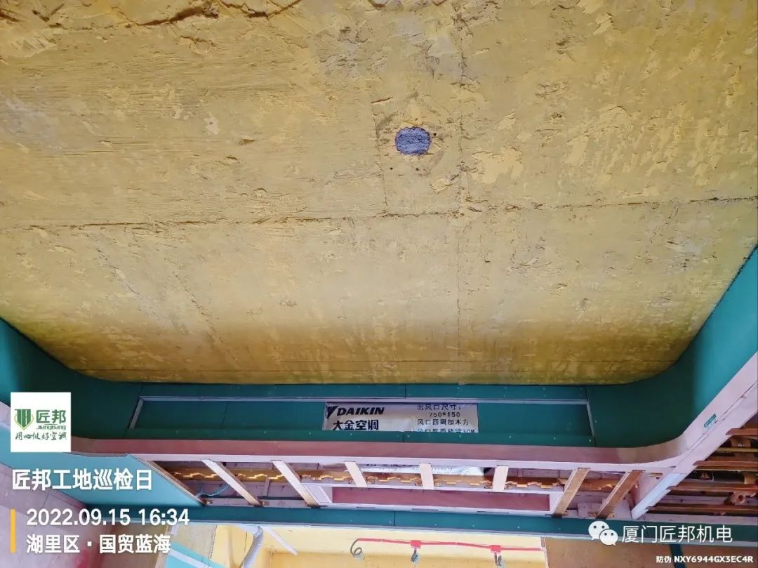 现场空调隐蔽工程部分已经完成,为避免后期空调出现风口被遮挡或出风面积不足导致风口滴水等情况,我司到场和木工着重对接空调的开口要求,确保木作开口满足每台空调的出、回风要求。