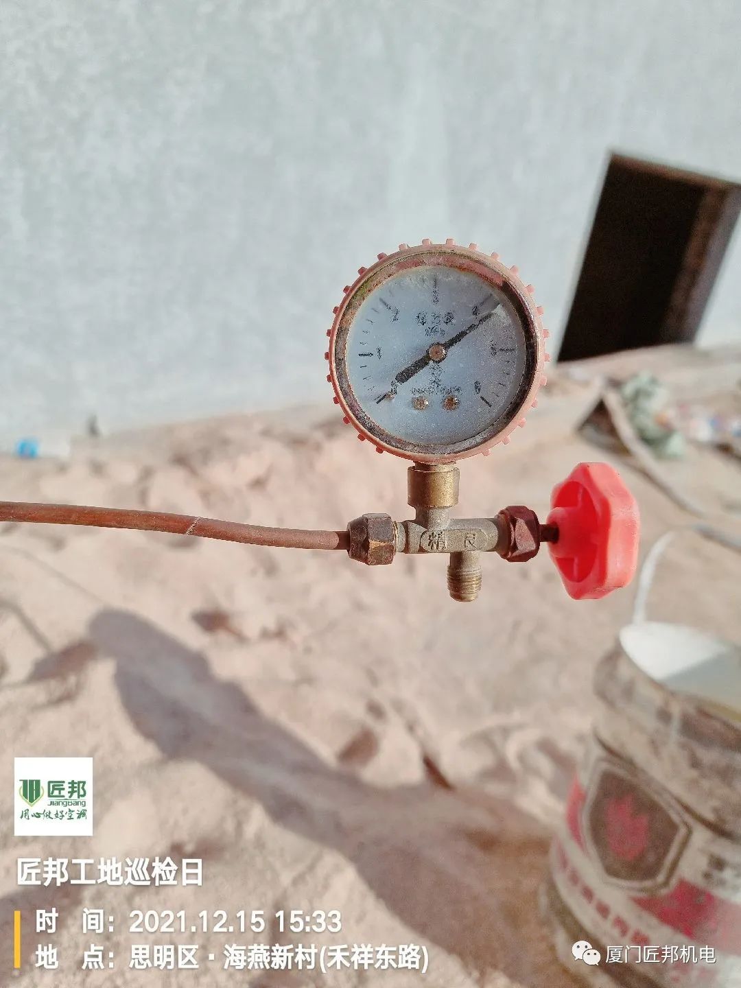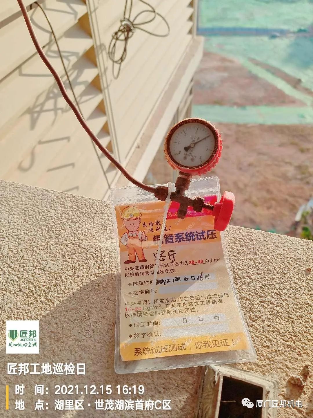 为确保空调铜管焊接无漏点,空调师傅在撤场时一定要进行系统保压测试,即充入4Mpa的氮气(未保主机)进行48小时的观察,届时匠邦监理会上门查看压力情况,压力不变才能保证系统密闭无泄漏点,后期可以正常使用。