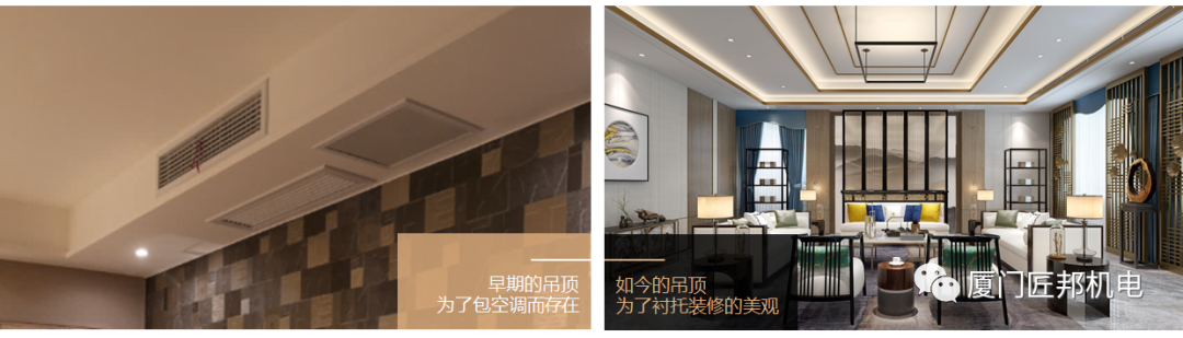 现如今,消费者的需求早已变得多样化,装修的风格也在不断升级迭代,最明显的一点就是:早期做吊顶大多是为了包空调,如今做吊顶是为了装饰美观,空调已经变成了将就吊顶的装饰品。