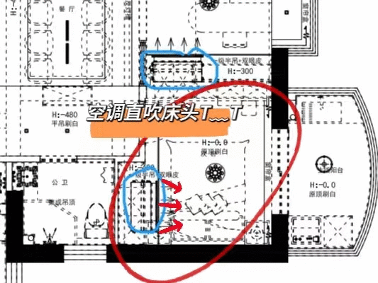 就像这个户型,如果是卖中央空调的商家可能会为了推全屋中央空调而导致这间卧室只能按图纸上这样摆放,最后只会空调吹床头、睡觉贼难受。