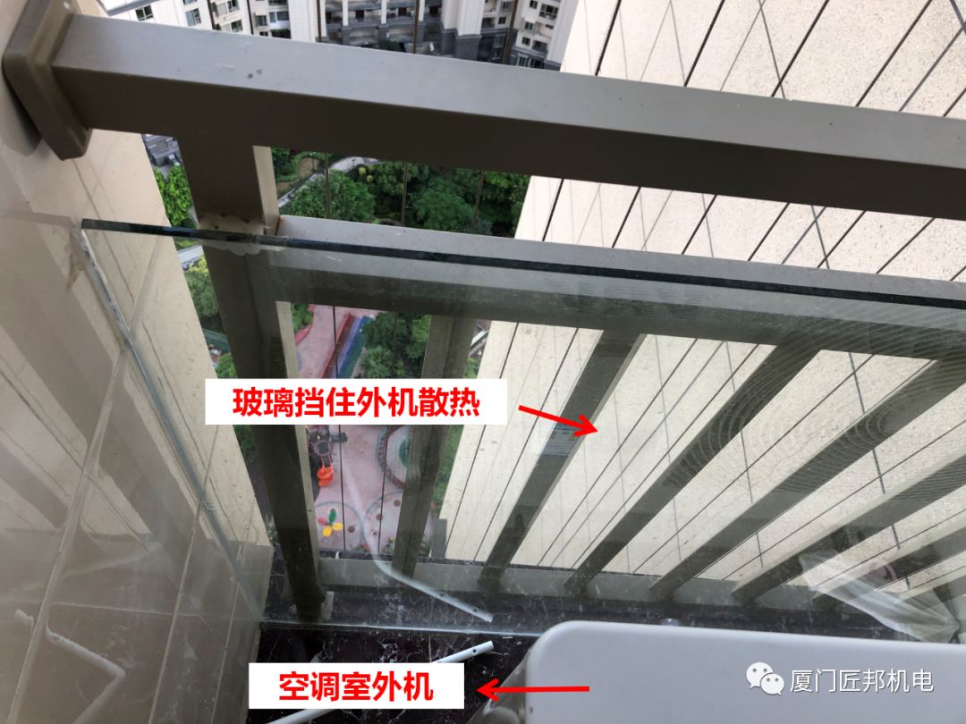 业主在栏杆处加装一面玻璃防止灰尘、雨水等损坏外机