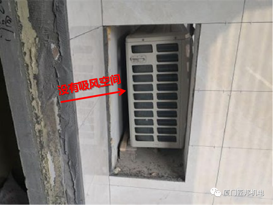 像上图这种外机背部紧贴墙面的程度,即使是热风散的出去,也不见得有风吸的回来~