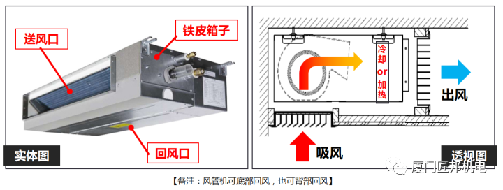 | 解析:回风口吸入室内热气-铁皮箱里进行降温-送风口吹出冷气【制冷时】。
