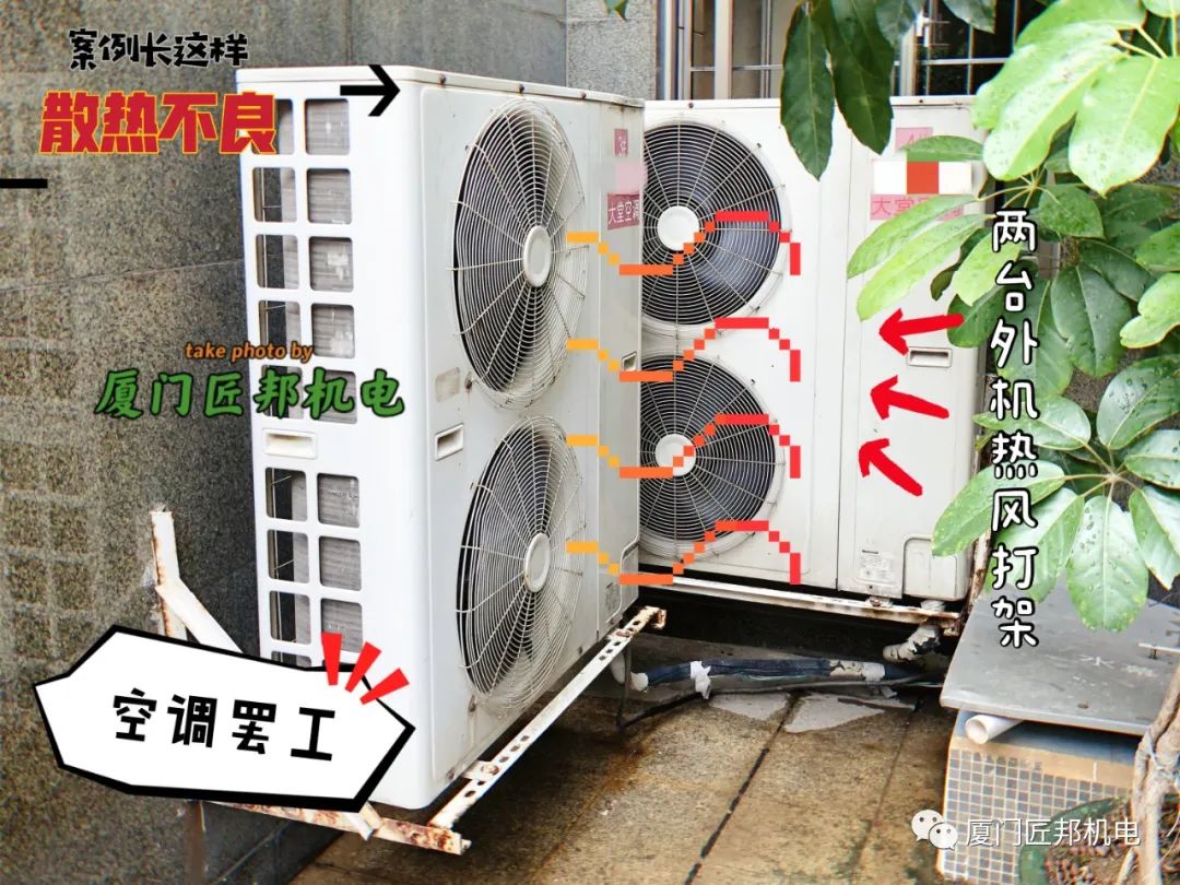 这是两台酒店大堂的空调外机,看起来位置卡的刚刚好,实际上散热互相打架,一旦两台外机同时开启运转,不用一会空调就开始报故障了!