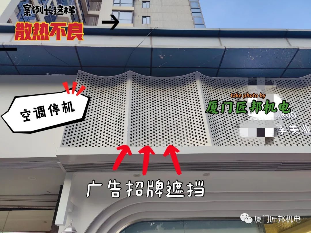 如图,空调外机被藏在广告招牌后面,外观上虽然是既美观又省空间,可实际却直接断送了这台外机的散热通道。