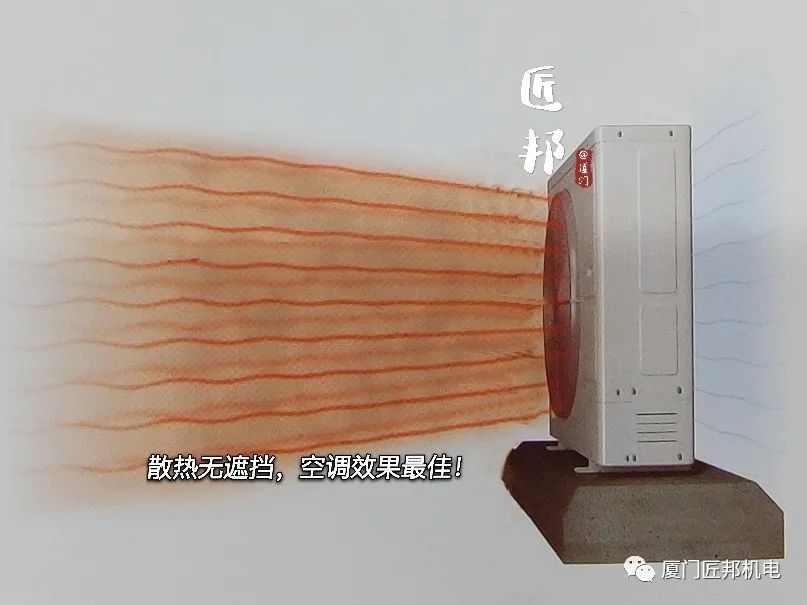 同样的道理,对于空调外机的话也要保证风扇前通风散热顺畅,空调效果才能有保障。