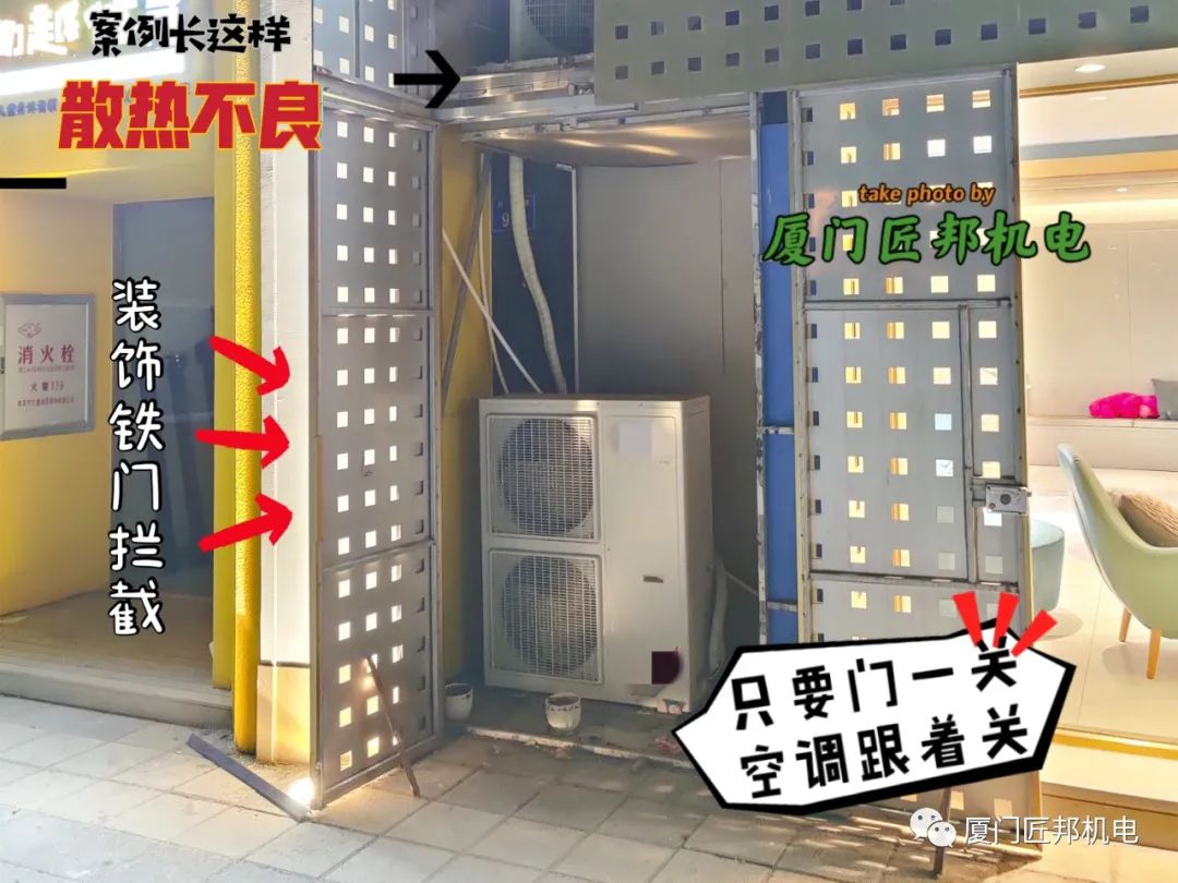 前期装修的时候,费了九牛二虎之力给空调外机配了这一面装饰铁门,结果等到店铺开张后,空调因为没办法正常散热而屡屡停机报警。
